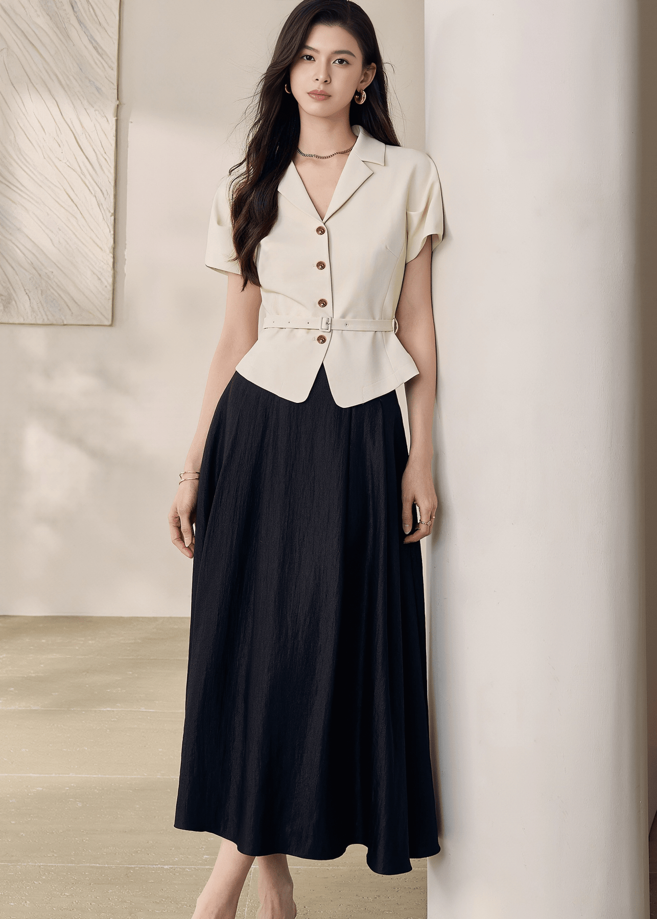 ウエストベルトでギュッと絞って、ペンシルスカートやスラックスでエレガントさを際立たせて。ベルトを外してリラクシーに羽織れば、デニムやワイドパンツとも好相性。ノーカラーシャツやタートルインで洗練されたレイヤードスタイルも楽しめます。